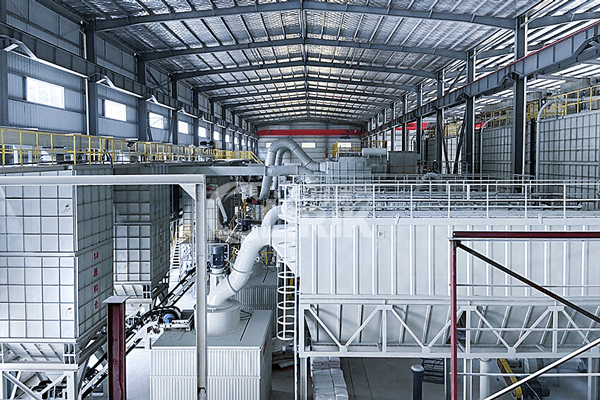 大塊物料經破碎機破碎到所需粒度(30mm)后,由提升機將物料送至儲料斗,再由皮帶機將物料均勻定量連續地送入主機磨室MTW175磨粉機內進行研磨。粉磨后的物料被風機氣流送入選粉機進行分級。在選粉機葉輪的作用下,不符合細度要求的物料落入磨室內重新碾磨;合格的物料則經空氣斜槽進入旋風集粉器內,進行分離收集,經排料裝置排出即為成品粉體。整個過程屬于閉路循環系統,并在正負壓狀態下運行,配備以脈沖除塵器,保證了生產現場的干凈、整潔。